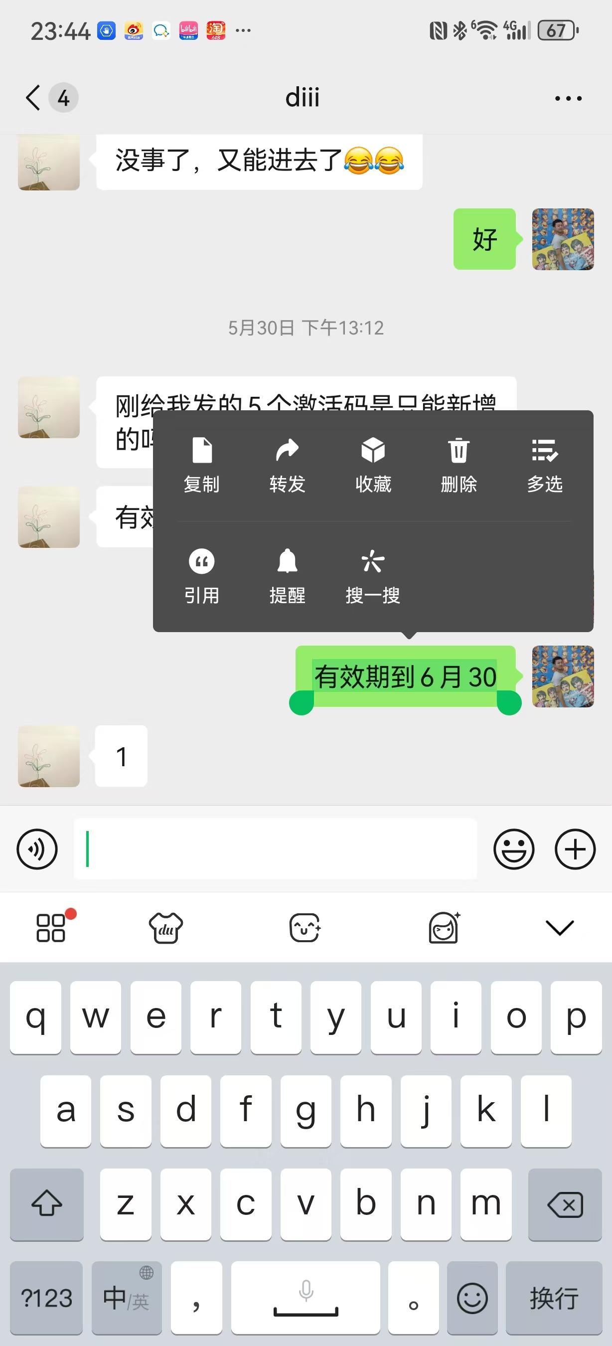 先选中云机外需要复制的字段,例如某通信软件中的一段话,点击复制。