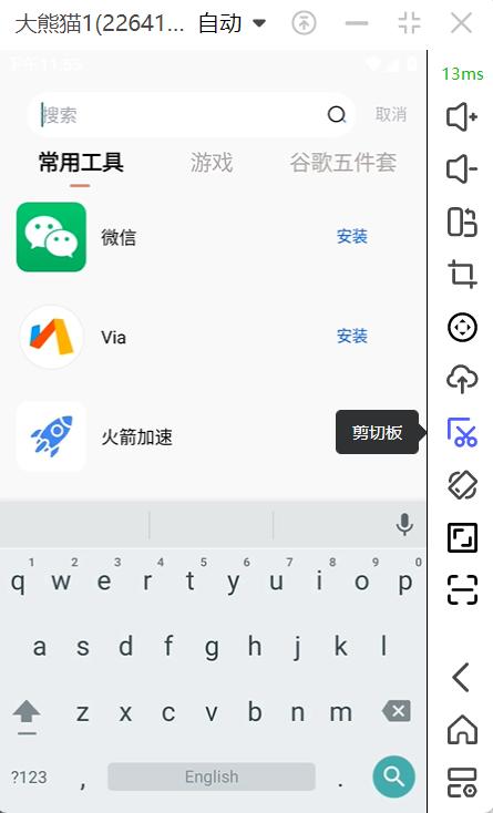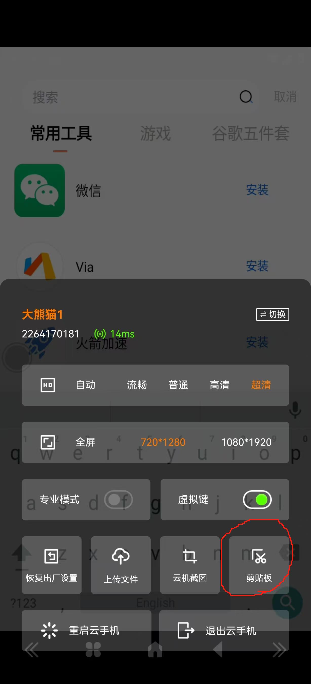 进入云机画面,选中输入框,点击右侧剪切板,将信息复制进入剪切板