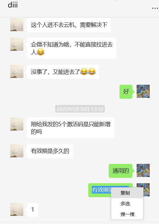1、先选中云机外需要复制的字段,例如某通信软件中的一段话,点击复制。