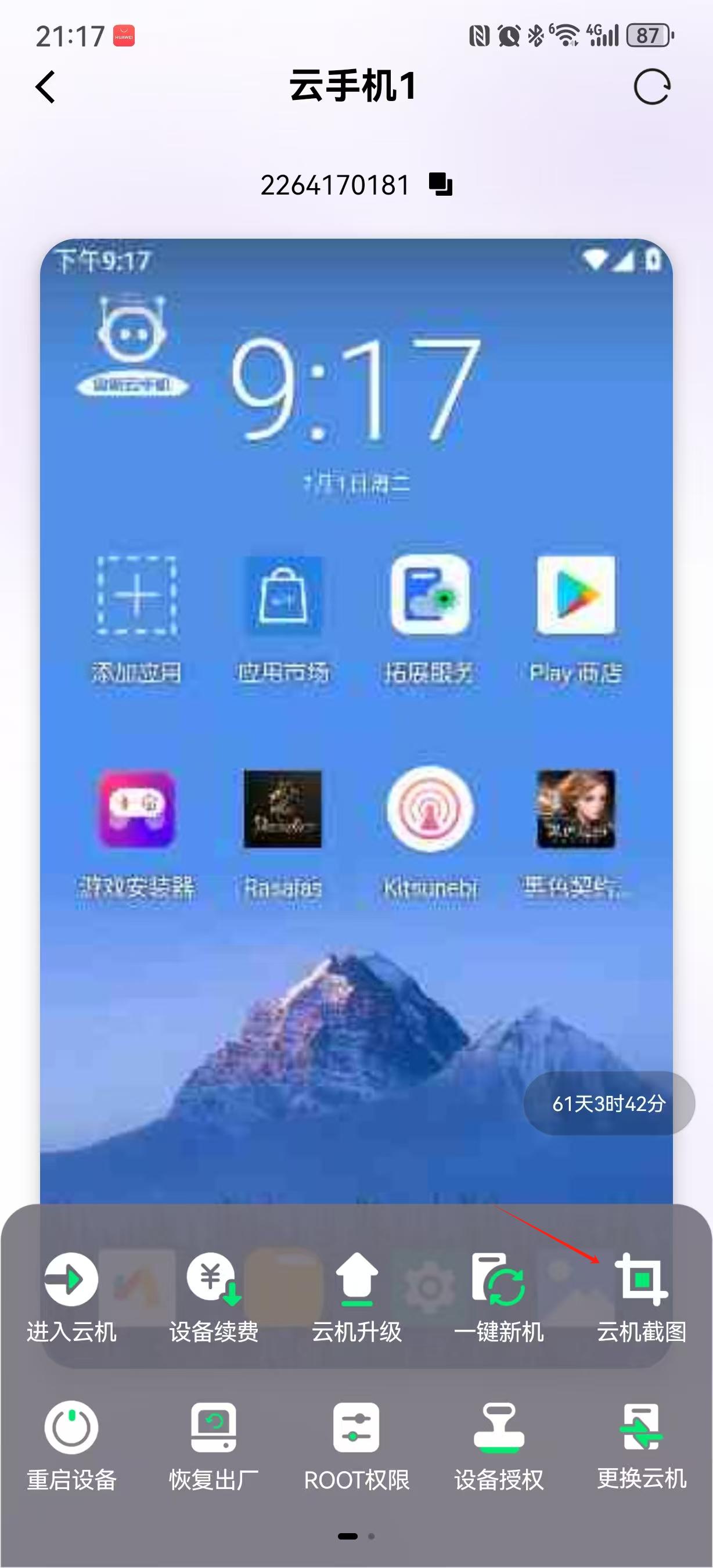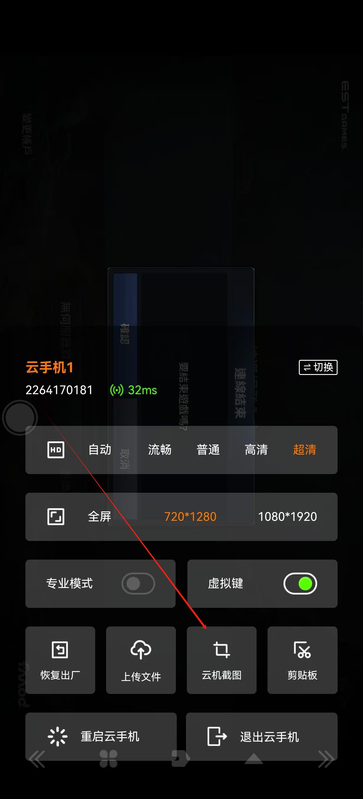 方法二:进入列表模式,点击需要截图的云机右下方“…”,在下方选项栏中点击“云机截图”