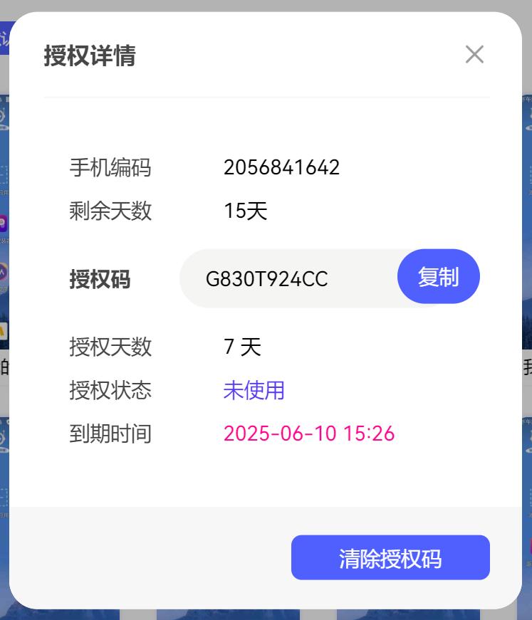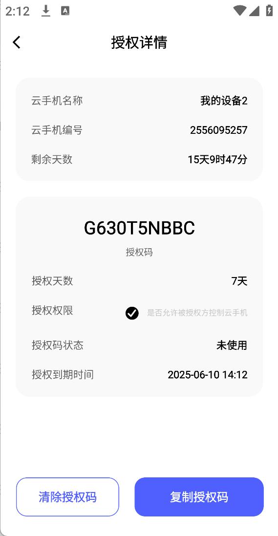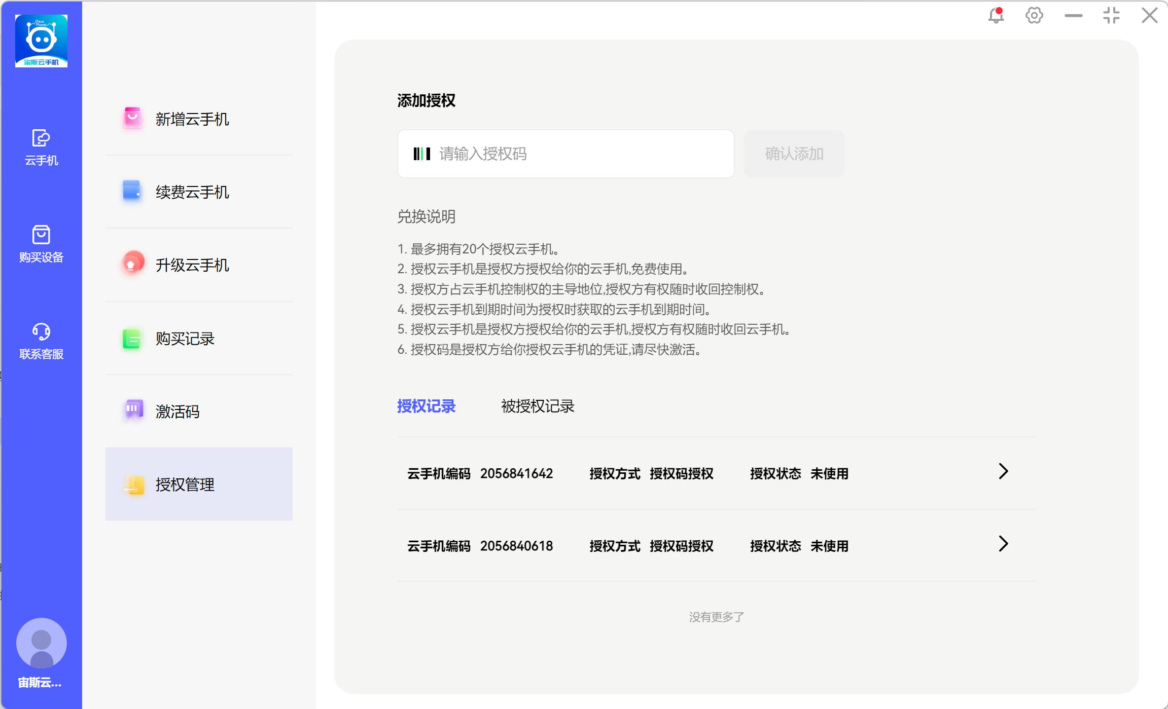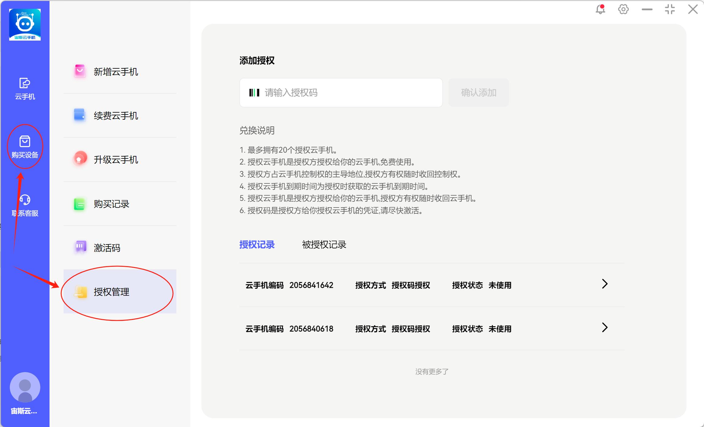 1、首页点击左侧购买设备-授权管理,查看授权云机和被授权云机信息,或输入授权码,获取授权的云手机