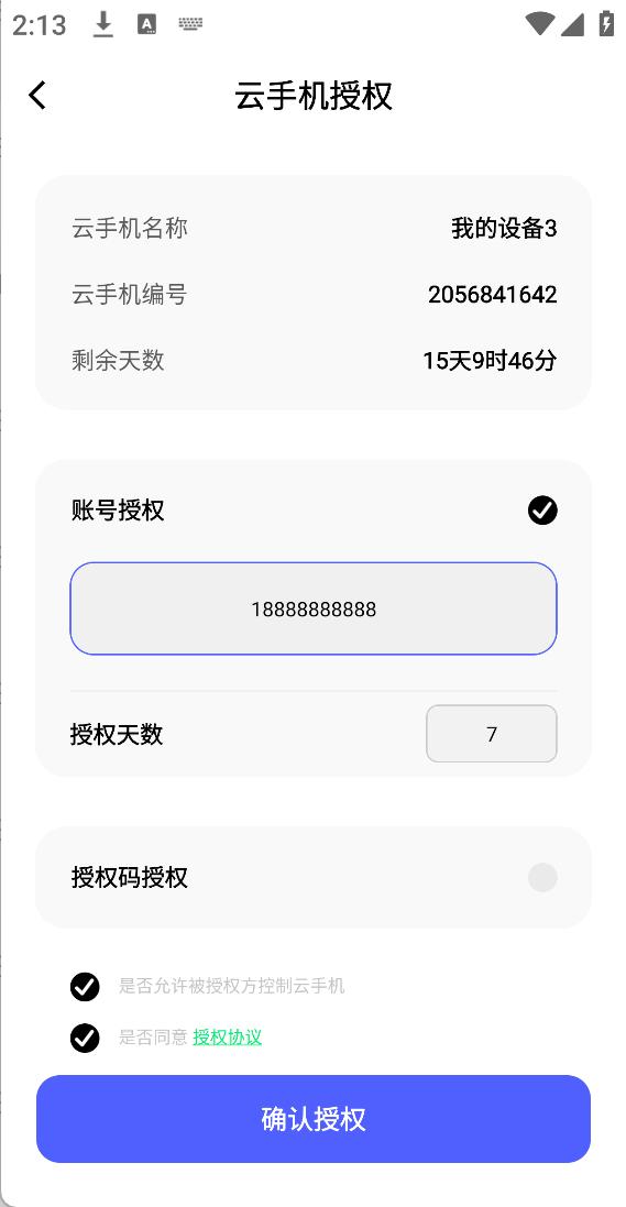 - 账号授权:输入被授权方账号或用户ID,被授权账号是对方注册宙斯云手机的手机号。