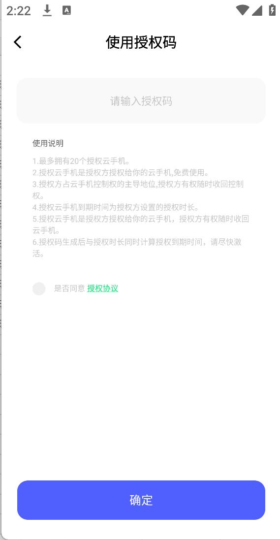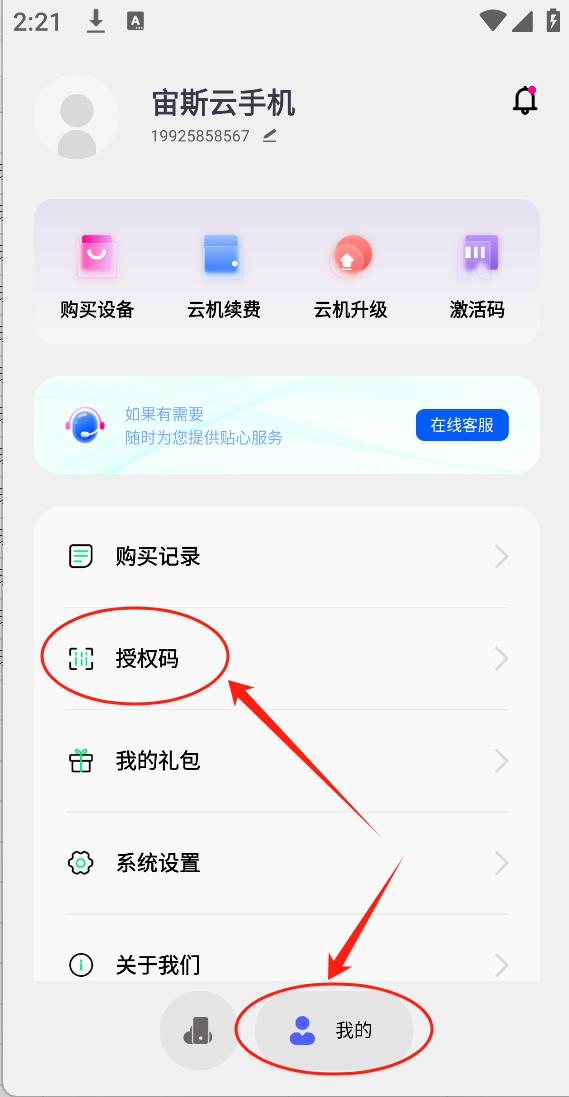 - 授权码使用:在个人中心,点击授权码,进入后输入授权码,获取授权的云手机: