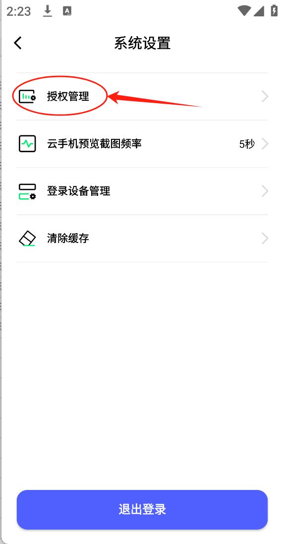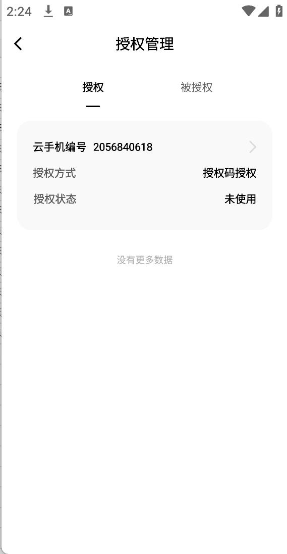 2、首页点击右上角系统设置-云手机设置-授权管理,查看授权云机和被授权云机信息,或输入授权码,获取授权的云手机。